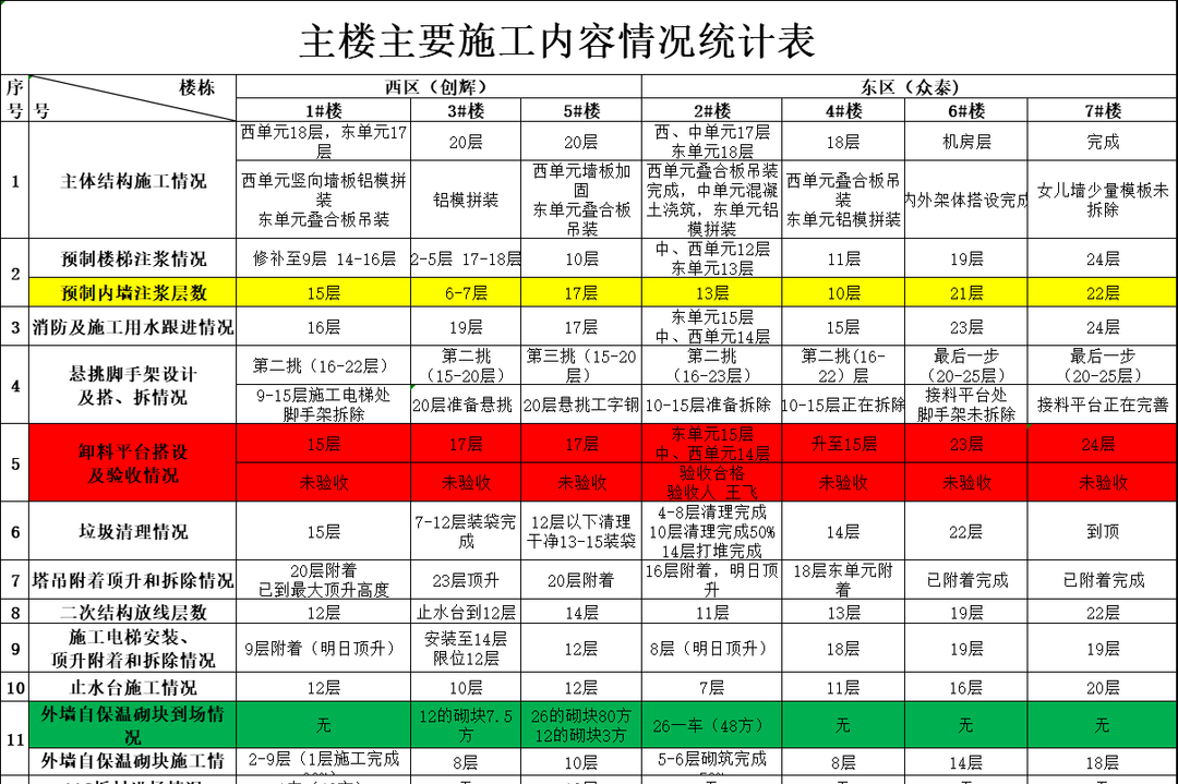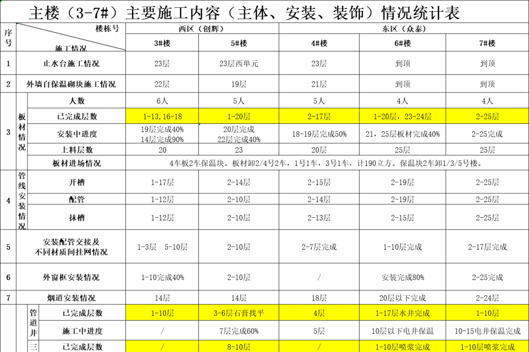 各樓棟專業工程師每日盤點通報現場進度情況,每日早中晚對比,緊盯關鍵工序;緊盯各工序的最早開始時間,督促各工作按節點完成,為后續施工創造有利條件。