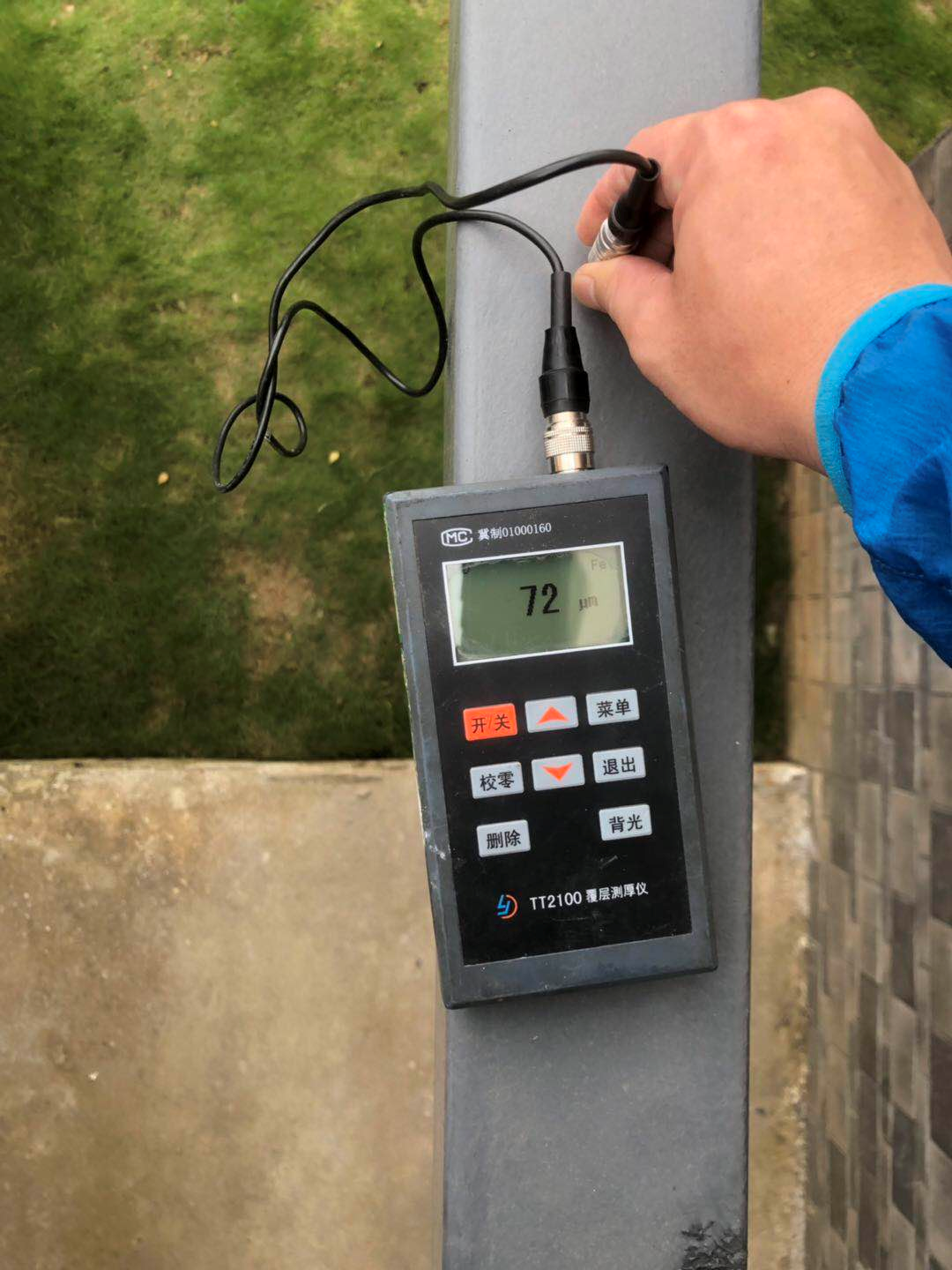 可采用涂層測厚儀進行檢測,最大量程不應小于1200μm,最小分辨率不應大于2μm,示值相對誤差不應大于3%。同一構件應檢測5處,每處的數值為3個相距50mm的測點涂層厚度的平均值。